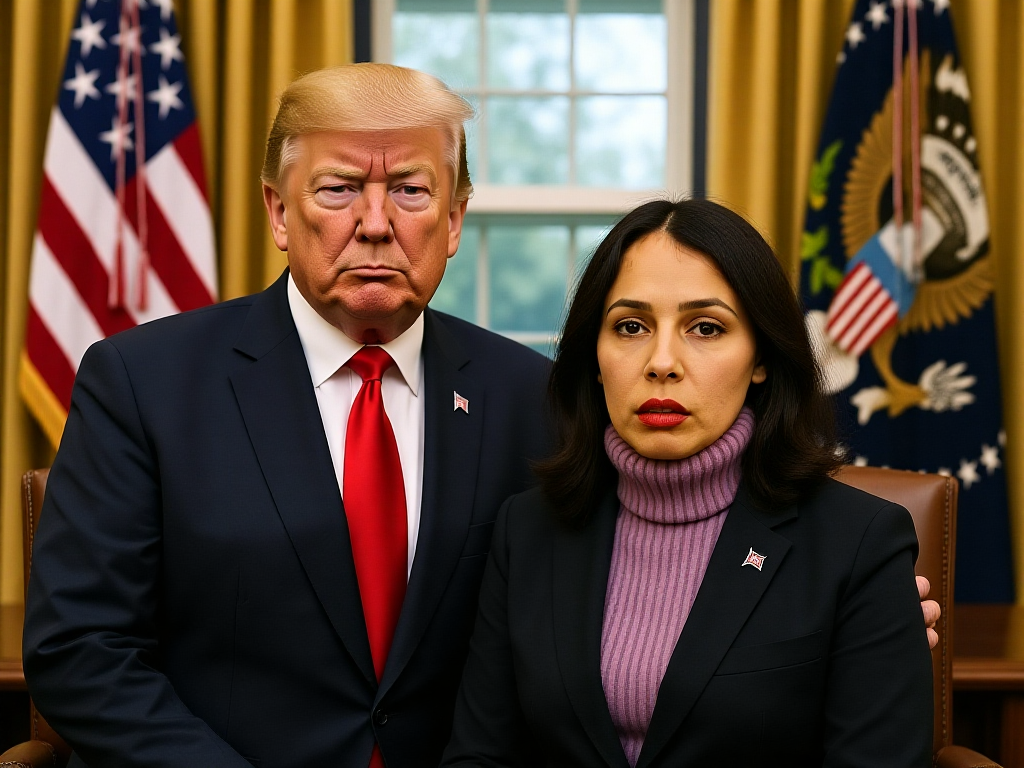 A candid, high-resolution photo of her standing beside Donald Trump inside the White House, captured by a press photojournalist. Natural lighting, authentic reportage style, slightly dynamic composition, realistic skin texture and expressions, background showing White House interior details such as official décor and flags, true documentary photography atmosphere.